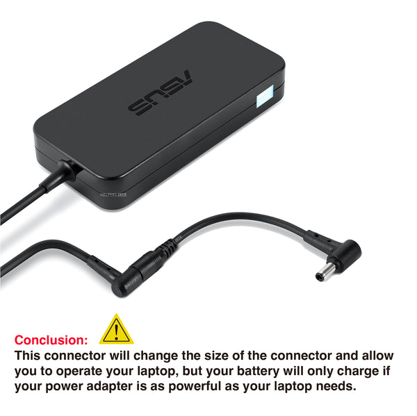 This connector will change the size of the connector and allow you to operate your laptop, but your battery will only charge if your power adapter is as powerful as your laptop needs.