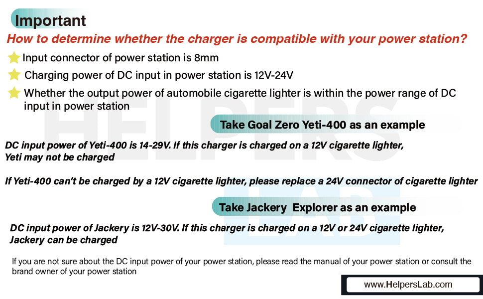 If you are not sure about the DC input power of your power station, please read the manual of your power station or consult the brand owner of your power station